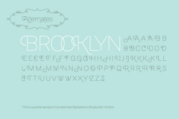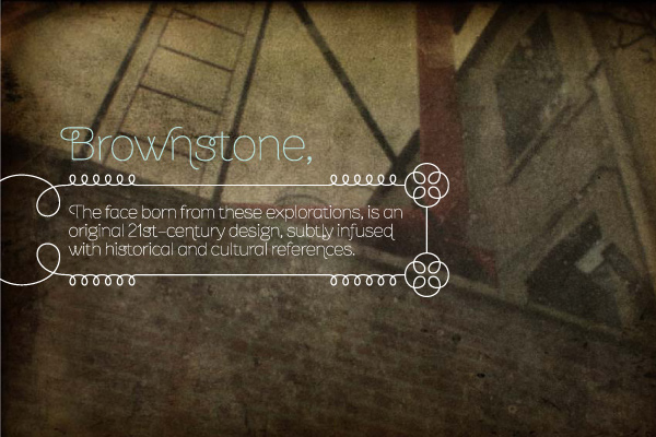 One design sparks another. As Alejandro Paul experimented with the strokes and curves of the monoline script Business Penmanship, he discovered interesting new forms and shapes that didn't fit the Spencerian theme of that typeface. These forms simmered in Ale's subconscious over the next three years, during which time he visited New York City, pored over rare type specimen books in the New York Public Library, and explored Brooklyn's neighborhoods. Brownstone, the face born from these explorations, is an original 21st-century design, yet one subtly infused with historical and cultural references â€" keen observers might spot influences from decorative typefaces of 19th-century foundries. And just as faces from that era were influenced by contemporary architecture, the frames included with Brownstone echo the ornate iron railings of Park Slope's row houses. (There's also a slight 1960s vibe to Brownstone, of novelty swash-sans photocompositing faces, that can be played up at your discretion.) Influences aside, Brownstone has broad appeal to modern audiences. A soft, monoline sans-serif, with elements of Swiss geometry (see the 'k' and 'x'), its marriage of highly legible, draftsman-like letterforms with decorative swashes and ornaments reflects the old-meets-new aesthetic of the DIY craft culture seen in Brooklyn and other urban centers. It's ornamental but unfussy, romantic but understated â€" a design theme well-suited to recession-era cynicism.