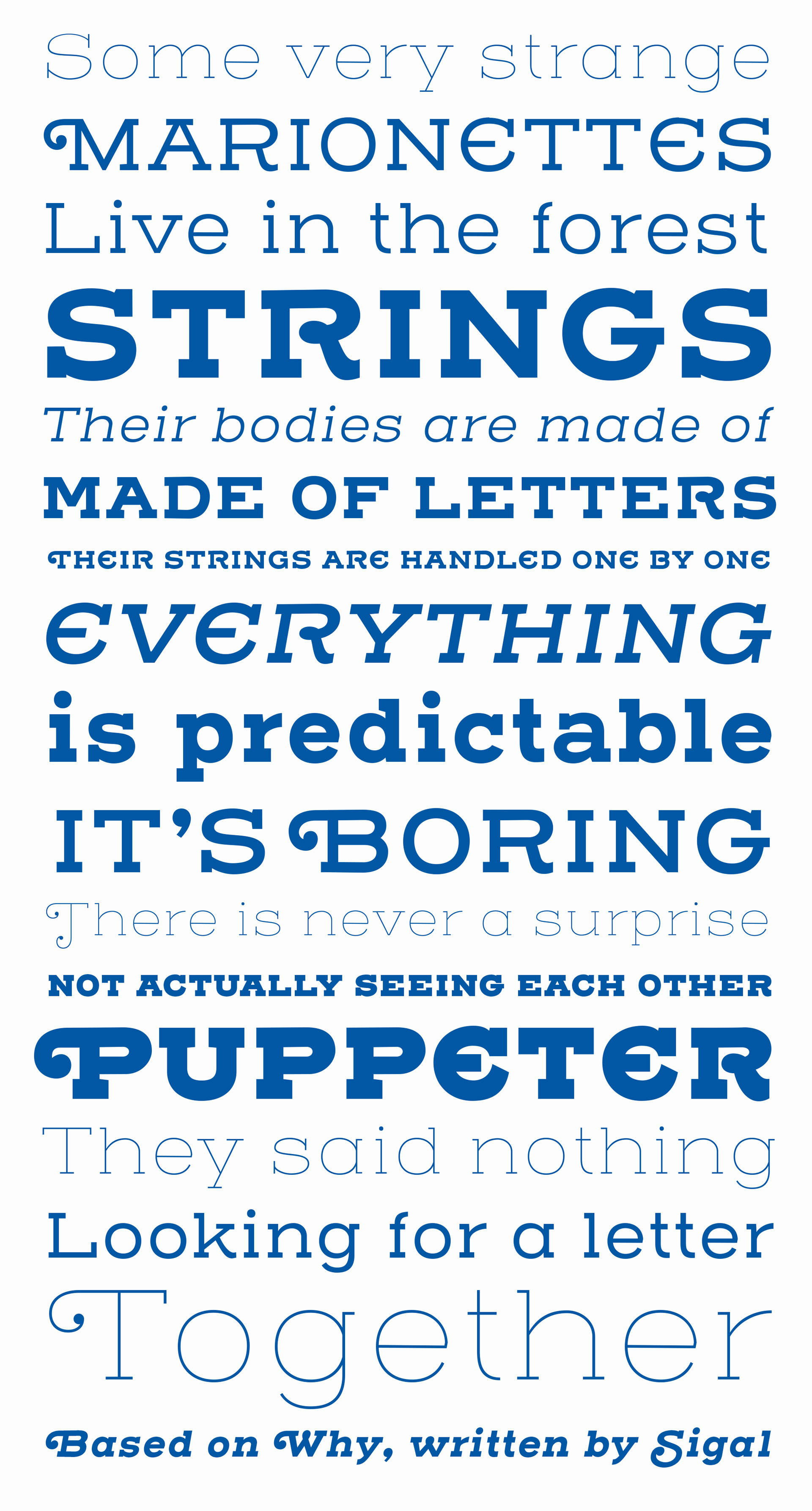 My exercise in the early lettering roots of what eventually became the definition of geometric typography ended up having a life of its own. The majuscules led to minuscules, one idiosyncratic bold weight led to six more, and uprights led to italics. What was kind-of-interesting in the early twentieth century persuaded me to make it interesting enough a century later. This of course meant alternates, swashes, the standard baggage that keeps calling my name.