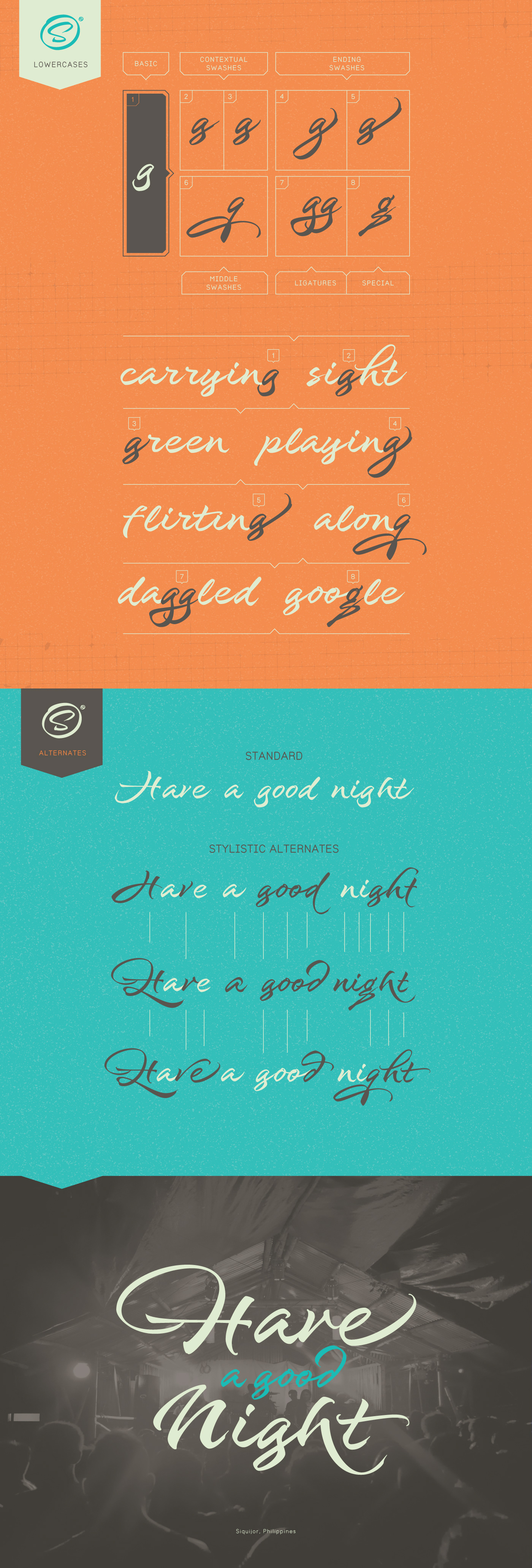 What at first was a quick sketch, over time, evolved into a stylized typography; that lends to humanistic-expressive calligraphy, optimized with wide variety of swash capitals, contextuals ligatures, ascending and descending, starting and ending letters and a wide range of characters for each glyph. Salamat provides the user absolute freedom to play, create words, sentences and even very stylized paragraphs. Giving one the freedom with type, the way the Philippines gave Joluvian the freedom to explore calligraphy and typography.